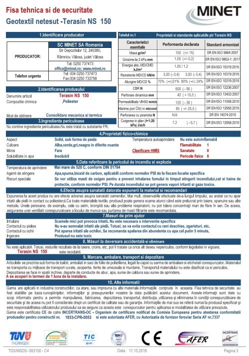 терасин ns е направен от 100% полиестерни влакна, има плътност 150 gr/mp , с ширина 2 m и дължина от 100 m .